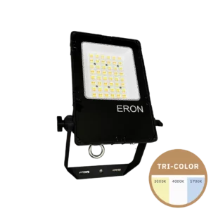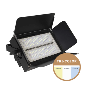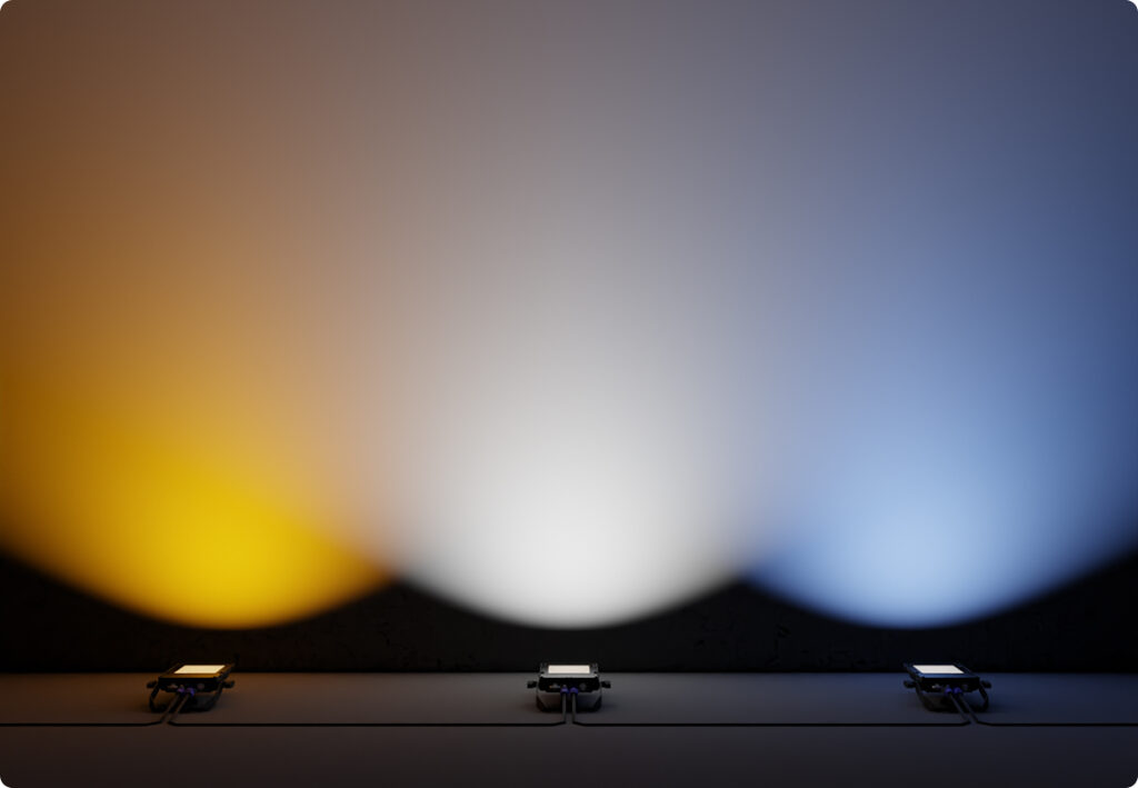 Die meisten Fluter aus dem Sortiment sind mit einem Tri-Color-Schalter ausgestattet. Damit stellst du im Voraus die gewünschte Lichtfarbe ein: warmweiß (3000K), neutralweiß (4000K) oder kaltweiß (5700K). So passt du die Beleuchtung perfekt an die gewünschte Atmosphäre des Standes an.