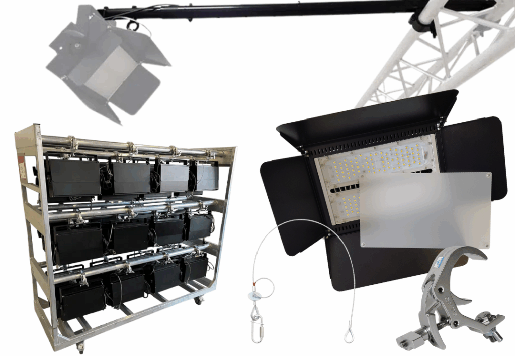 Die Fluter können einfach in die gewünschte Position mit den Drehknöpfen an der Seite eingestellt werden. Für die Montage an Traversen verwenden Sie die passenden Klemmen und ein Sicherheitskabel, damit die Installation schnell und sicher verläuft.