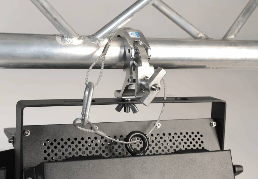 Mit Truss-Clamps lassen sich die Strahler einfach und sicher am Truss befestigen. Jeder Fluter verfügt über einen integrierten Safety-Ring und kann mit einem Safety-Kabel gesichert werden.