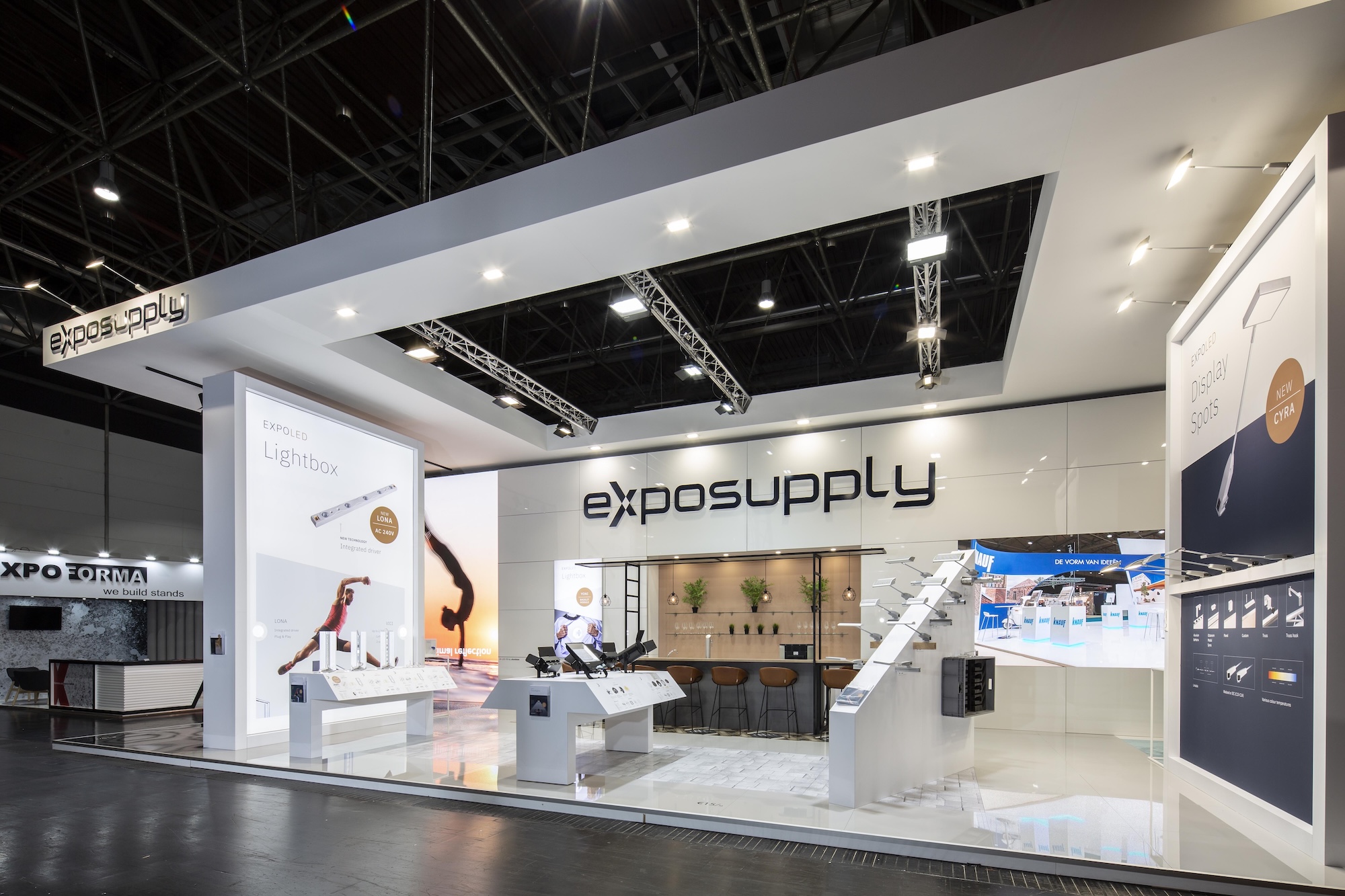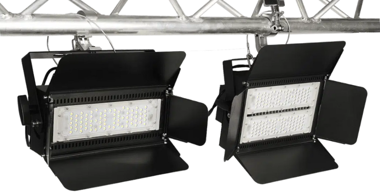 Die Fluter von Exposupply kombinieren hohe Wattzahlen mit integrierten 90°-Linsen. Dadurch wird das Licht gleichmäßig verteilt und Messestände von oben hell und gleichmäßig ausgeleuchtet. Mit Lichtleistungen von über 30.000 Lumen sind sie ideal für hohe Traversenkonstruktionen und die Beleuchtung großer Flächen. Darüber hinaus sind die Fluter flimmerfrei.
