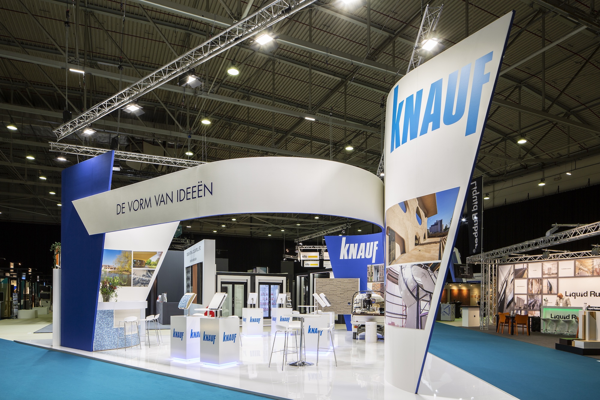 Fluter sorgen für eine kraftvolle und gleichmäßige Beleuchtung von Messeständen, sicher und fachgerecht an einer Traverse zu montieren.