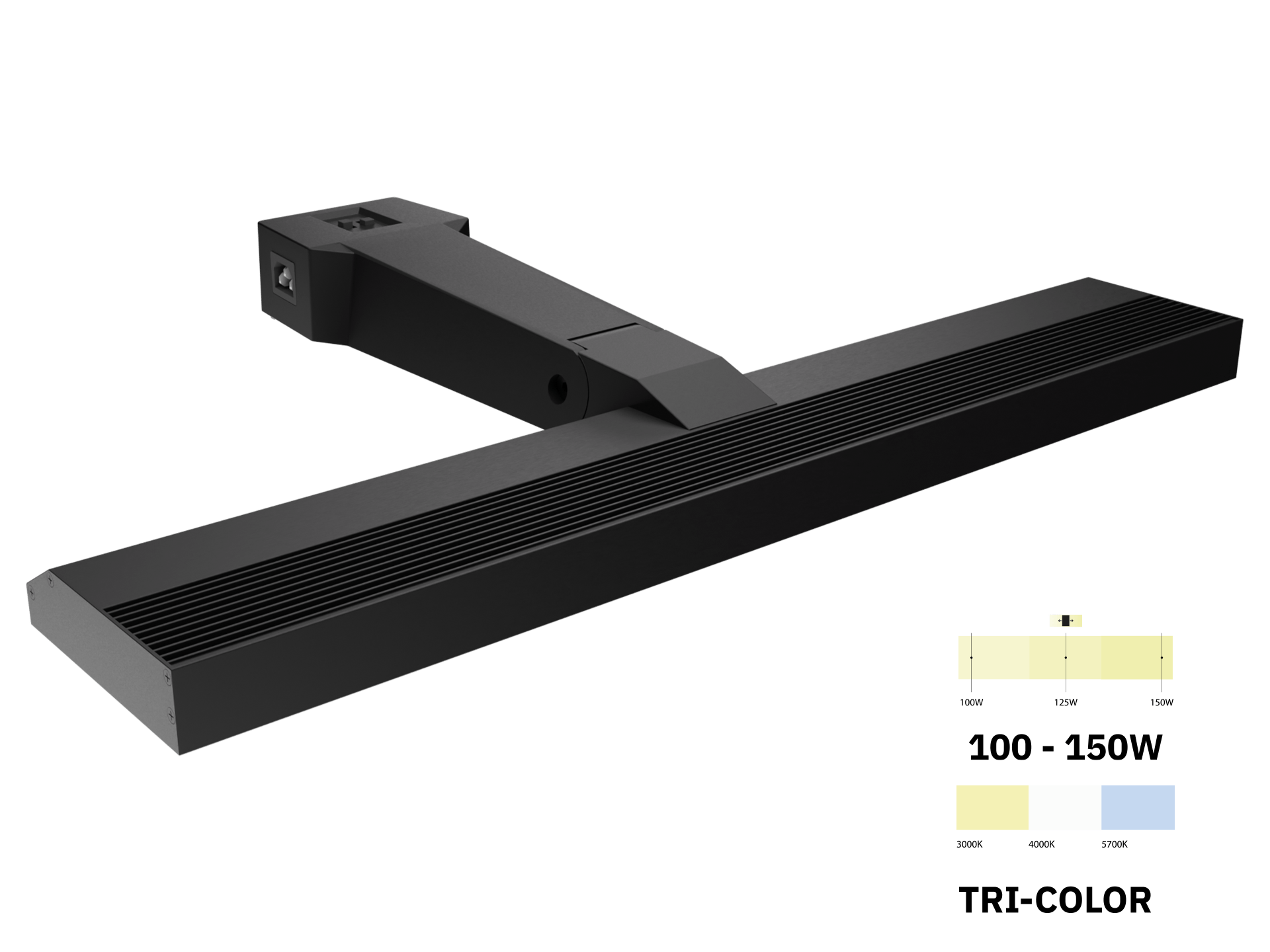 Der Tri-Color-Schalter ermöglicht es, die Lampe einfach auf verschiedene Farbtemperaturen (3000, 4000 oder 5700K) einzustellen. Der zweite Schalter lässt die Lampe einfach in der Leistung variieren, indem sie auf 100, 125 oder 150 Watt geschaltet wird. Dadurch ist die Lampe in mehreren Höhen einsetzbar. Darüber hinaus ist der Kopf der Lampe noch in einem Winkel bis zu 20 Grad einstellbar, um die Ausleuchtung der Fläche zu perfektionieren.