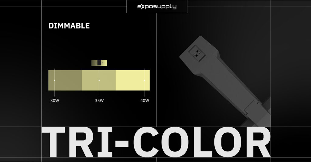 Mit dem Tri-Color-Schalter wechseln Sie einfach zwischen drei Farbtemperaturen: Warmweiß (3000K), Neutralweiß (4000K) und Kaltweiß (5700K). So passen Sie die Beleuchtung einfach an die gewünschte Atmosphäre und Ausstrahlung des Standes an.