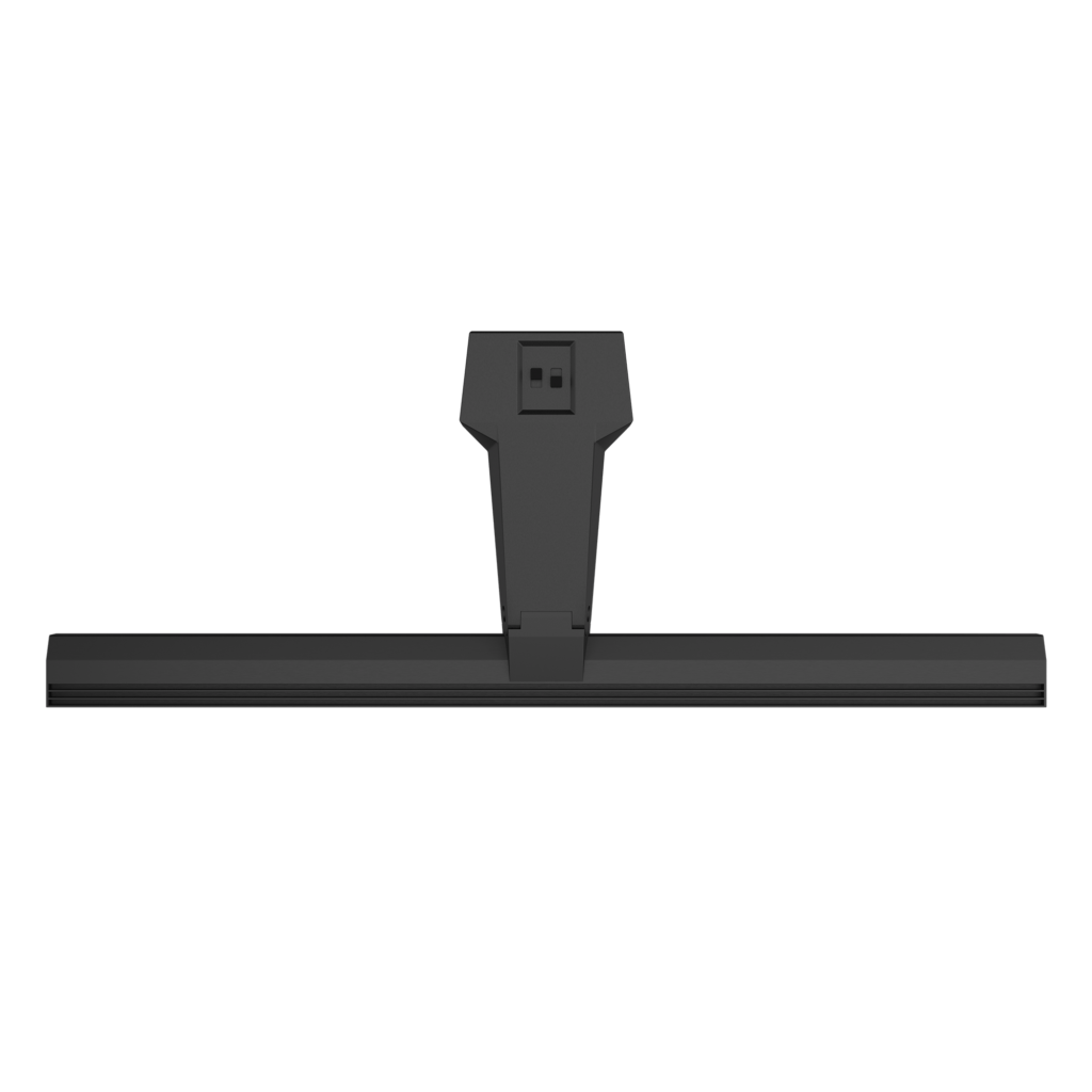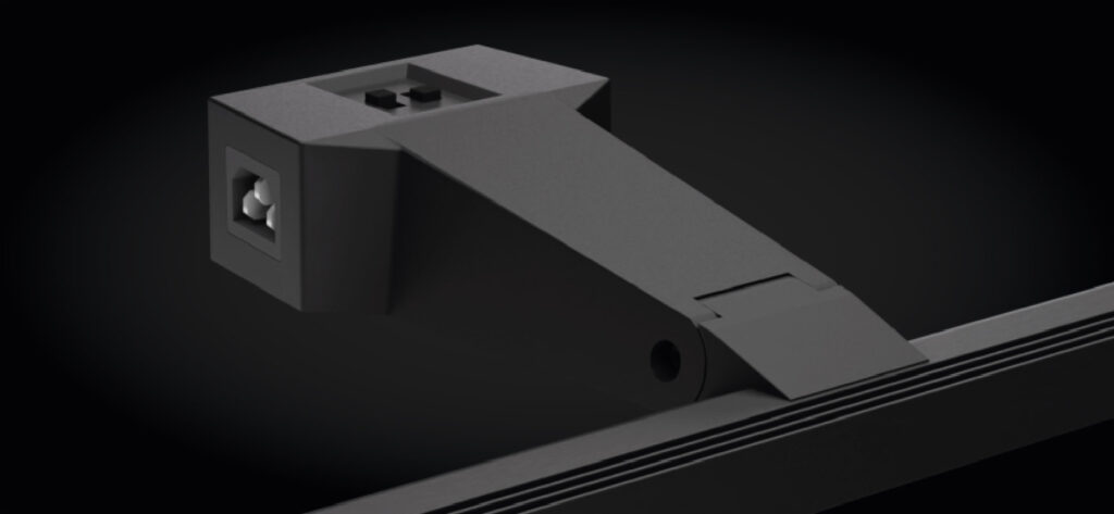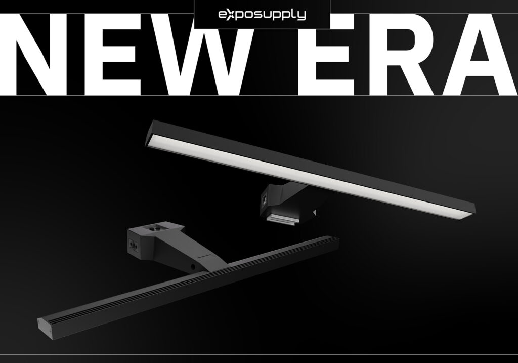 Charakteristisch ist das moderne Design. Die Lampe unterstützt das Standdesign, ohne die Aufmerksamkeit auf sich zu ziehen. Wände und Visuals werden gepflegt und gleichmäßig ausgeleuchtet. Ideal für moderne Messestände und Präsentationen.