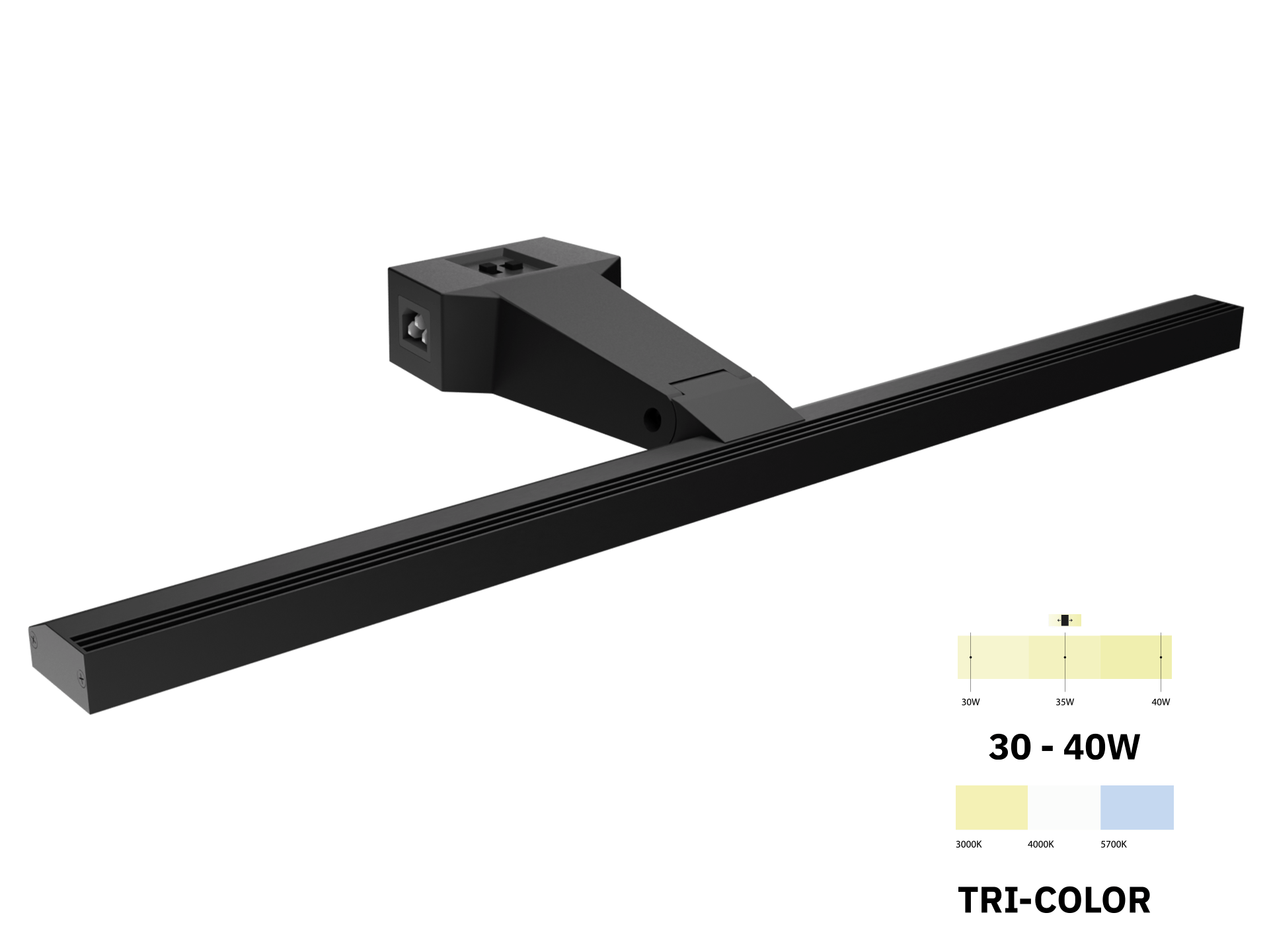 Der Tri-Color-Schalter ermöglicht es, die Lampe einfach auf verschiedene Farbtemperaturen (3000, 4000 oder 5700K) einzustellen. Der zweite Schalter lässt die Lampe in der Leistung variieren (30, 40 oder 45W), um die perfekte Lichtverhältnis zu schaffen. Darüber hinaus ist der Lampenkopf in einem Winkel von bis zu 20 Grad einstellbar, um die Ausleuchtung der jeweiligen Oberfläche zu perfektionieren.