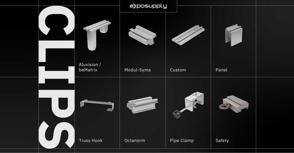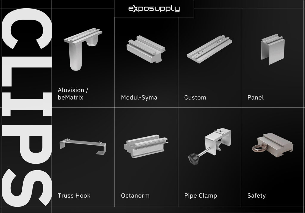 Mit den verschiedenen Montageclips sind unsere Langarmstrahler in jedem Standbausystem einsetzbar.