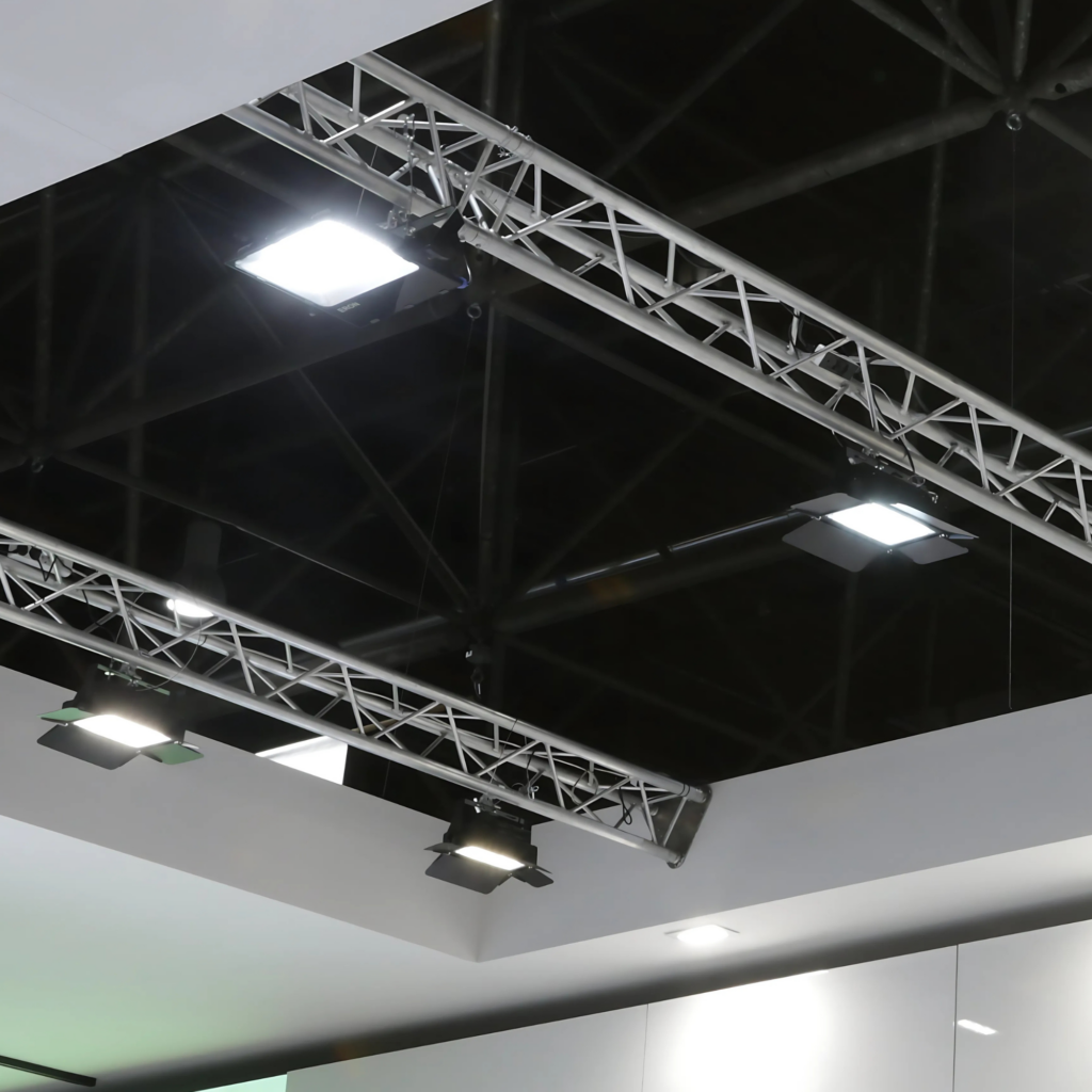 Traversenbeleuchtung ist ideal für die Beleuchtung eines gesamten Messestandes, insbesondere auf hoher Höhe. Unsere Flutlichtstrahler und Parlights sind speziell für den Standbau entwickelt und lassen sich einfach an Truss-Systemen montieren, wodurch sie hervorragend für die Beleuchtung großer Flächen und Produktbereiche geeignet sind.